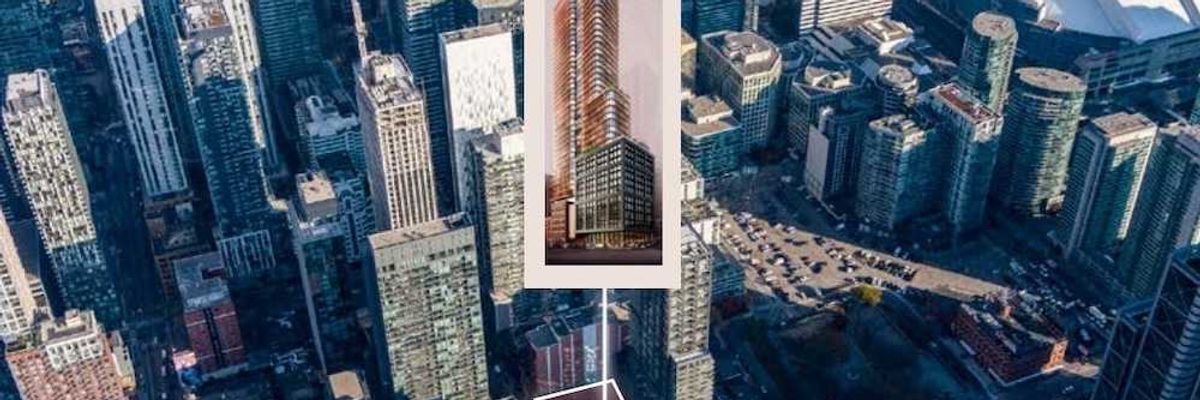 An application was submitted in 2010 for a 39-storey residential tower with a total gross floor area of 372,044 sq. ft, but the application was later revised up to a 56-storey mixed-use tower with a total gross floor area of 518,971 sq. ft, according to a City of Toronto staff report.